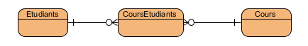 Dans l'exemple ci-dessous, un étudiant assiste à des cours. Et un cours a des étudiants. Il s'agit d'une relation plusieurs à plusieurs, mais sans la table pivot.
