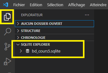 Dans la section Explorateur à gauche (CTRL+MAJ+E si non visible), ouvrez la section SQLITE EXPLORER