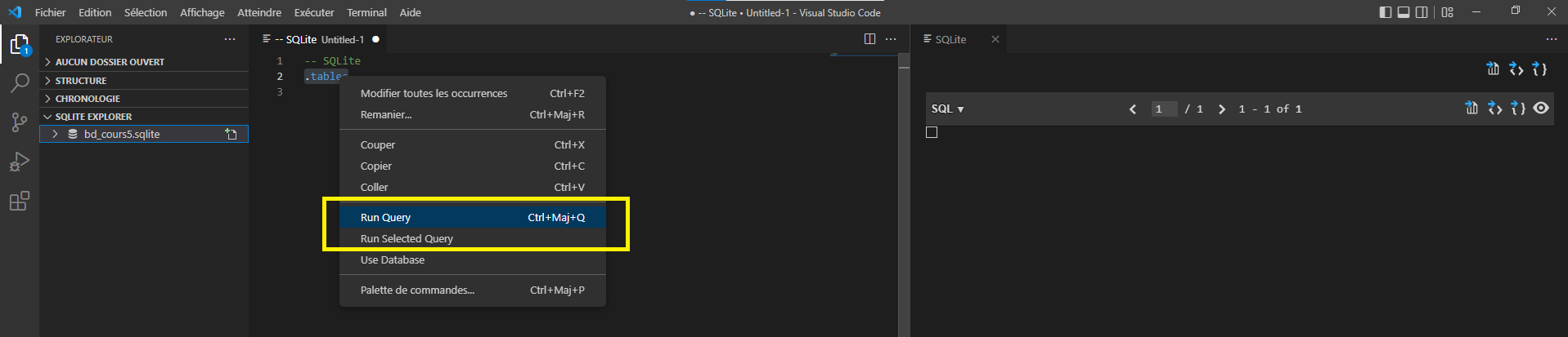 - Tout le document -> Clic-droit -> Run Query ou CTRL+MAJ+Q