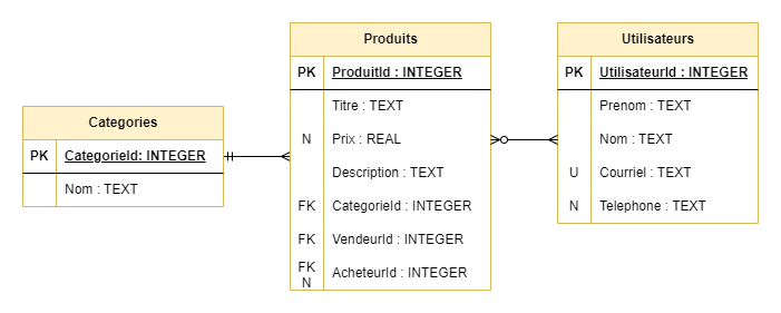 CREATE TABLE Categories( CategorieId INTEGER NOT NULL PRIMARY KEY, Nom TEXT NOT NULL CHECK (Nom <> ''));CREATE TABLE Utilisateurs( UtilisateurId INTEGER NOT NULL PRIMARY KEY, Prenom TEXT NOT NULL CHECK (Prenom <> ''), Nom TEXT NOT NULL CHECK (Nom <> ''), Courriel TEXT NOT NULL UNIQUE CHECK (Courriel <> ''), Telephone TEXT CHECK (Telephone <> ''));